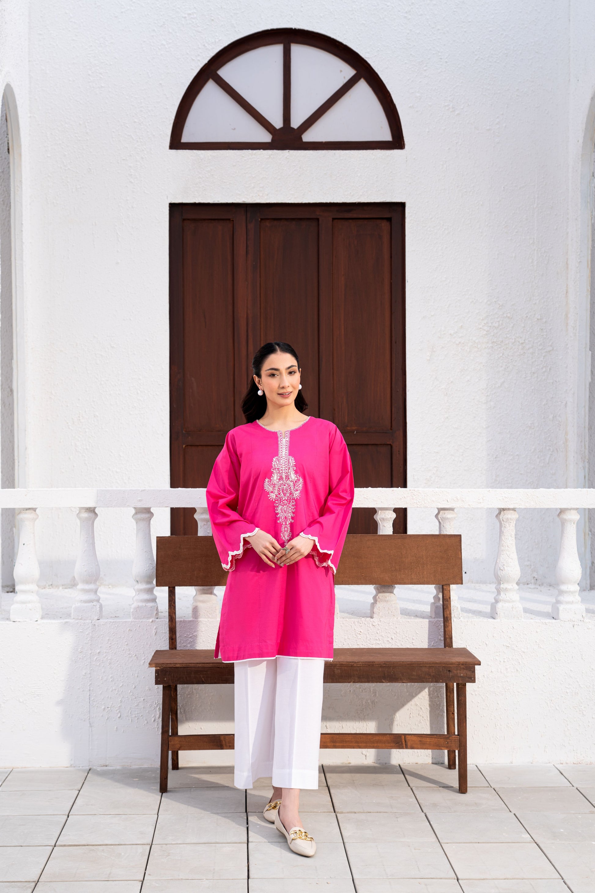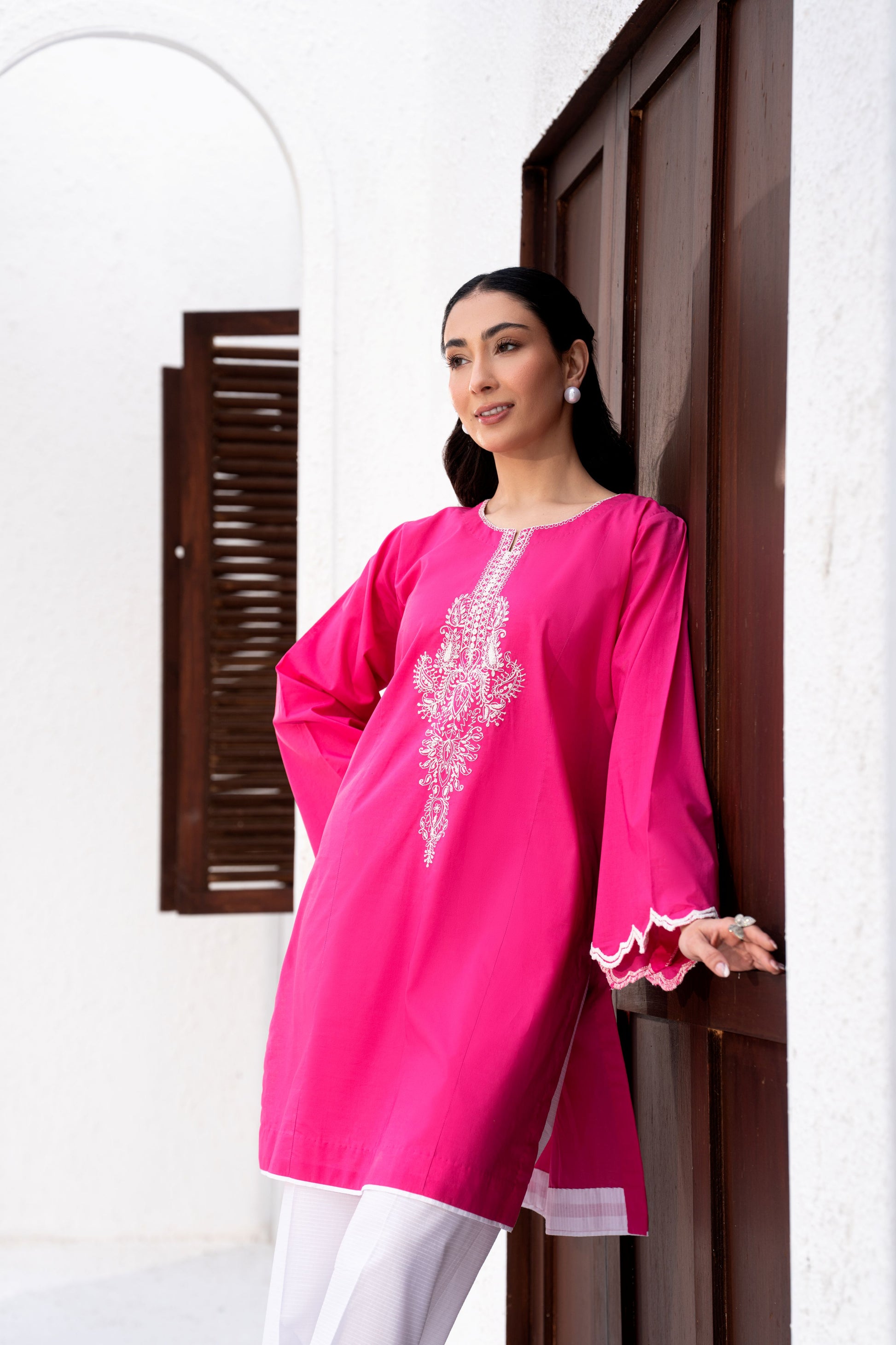 A vibrant fuchsia lawn two-piece ensemble designed to make a graceful statement. Featuring intricate embroidery on the neckline and sleeves, the outfit is paired with crisp white culottes that add a refreshing contrast, creating a perfect blend of elegance and contemporary style.